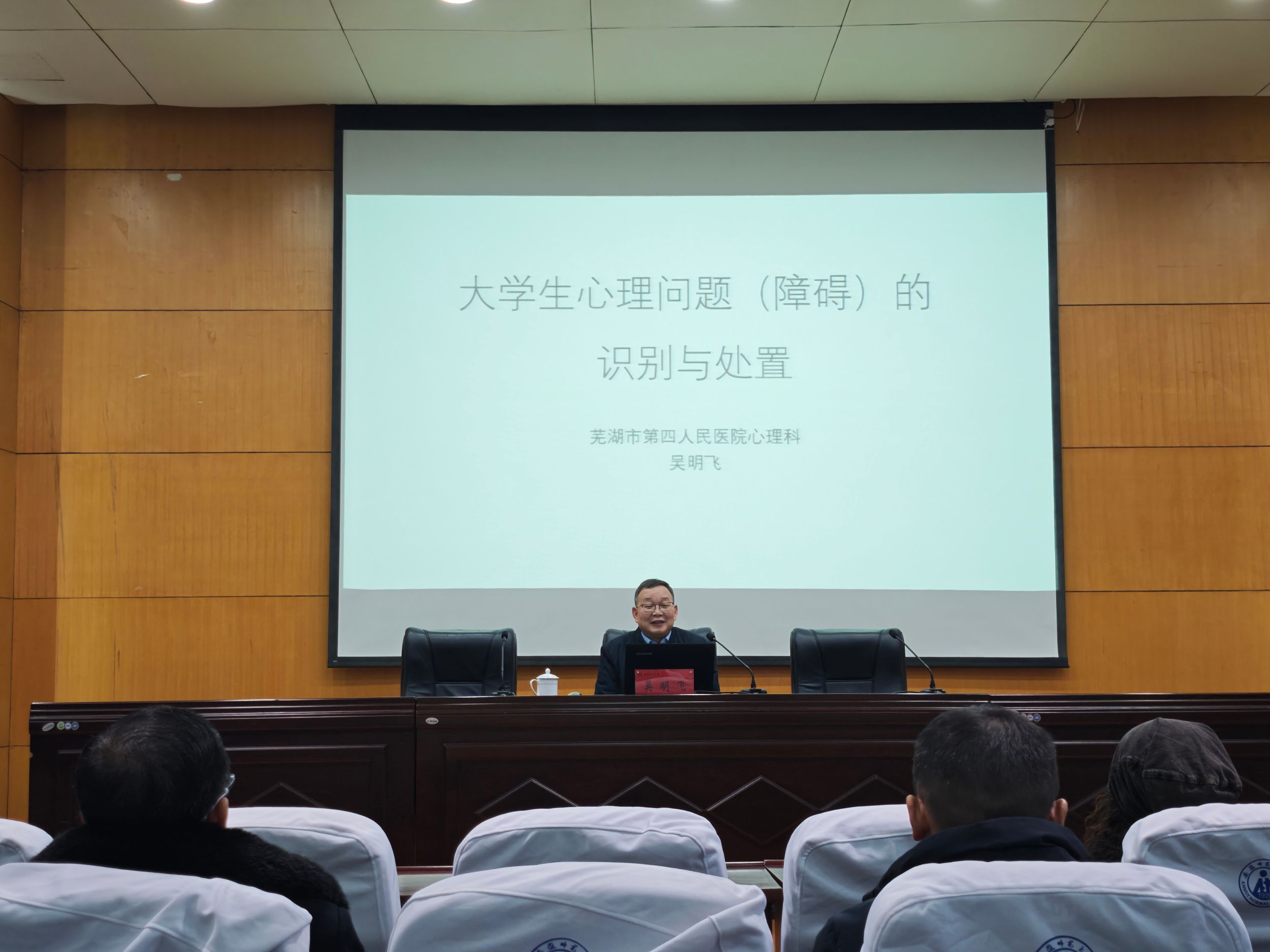 芜湖市第四人民医院心理科主任吴明飞作题为《大学生心理问题(障碍)的识别与处置》的专题讲座。他以大学生常见的心理问题及心理障碍开篇,阐述了心理问题(障碍)的识别和处置原则,从专家的视角科普了常见的精神类药物治疗和相关法律规定。他指出,及时发现和有效干预是预防和解决大学生心理问题与心理障碍的关键途径。