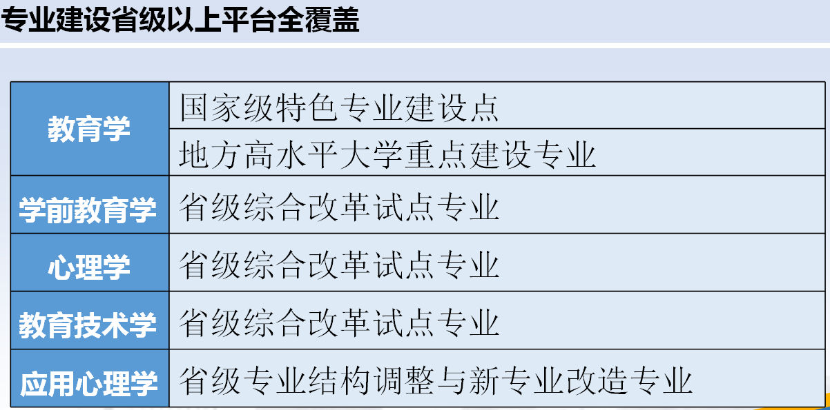 教育技术学、应用心理学专业分别获批2015年省级质量工程项目“省级综合改革试点专业”、“省级专业结构优化与专业改造项目”立项。至此,教育学、心理学、学前教育等5个本科专业全部实现了省级以上高端建设平台全覆盖。