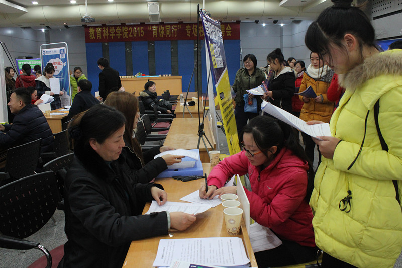 本网讯(教科院 孟庆娟 张琼文)就业是民生之本,创业是就业之源。教科院高度重视2016届毕业生就业创业工作,本学年着重以提高人才培养质量为基础,创新毕业生就业服务体系,全力推进“育你同行工程”,目前各类就业专项活动如火如荼进行中。继2014年成功举办首场“育你同行”专场校园招聘会之后,12月29日下午,该院又举行了2015“育你同行”校园专场招聘会,及时地为各位准毕业生开通了一条绿色通道。北京红缨集团合肥园区、合肥高新中加学校、易通心理咨询有限公司等来自省内外的近30家用人单位前来招聘,共提供就业岗位600余个,吸引以该院毕业生为主的我校数百名学生前来求职应聘。