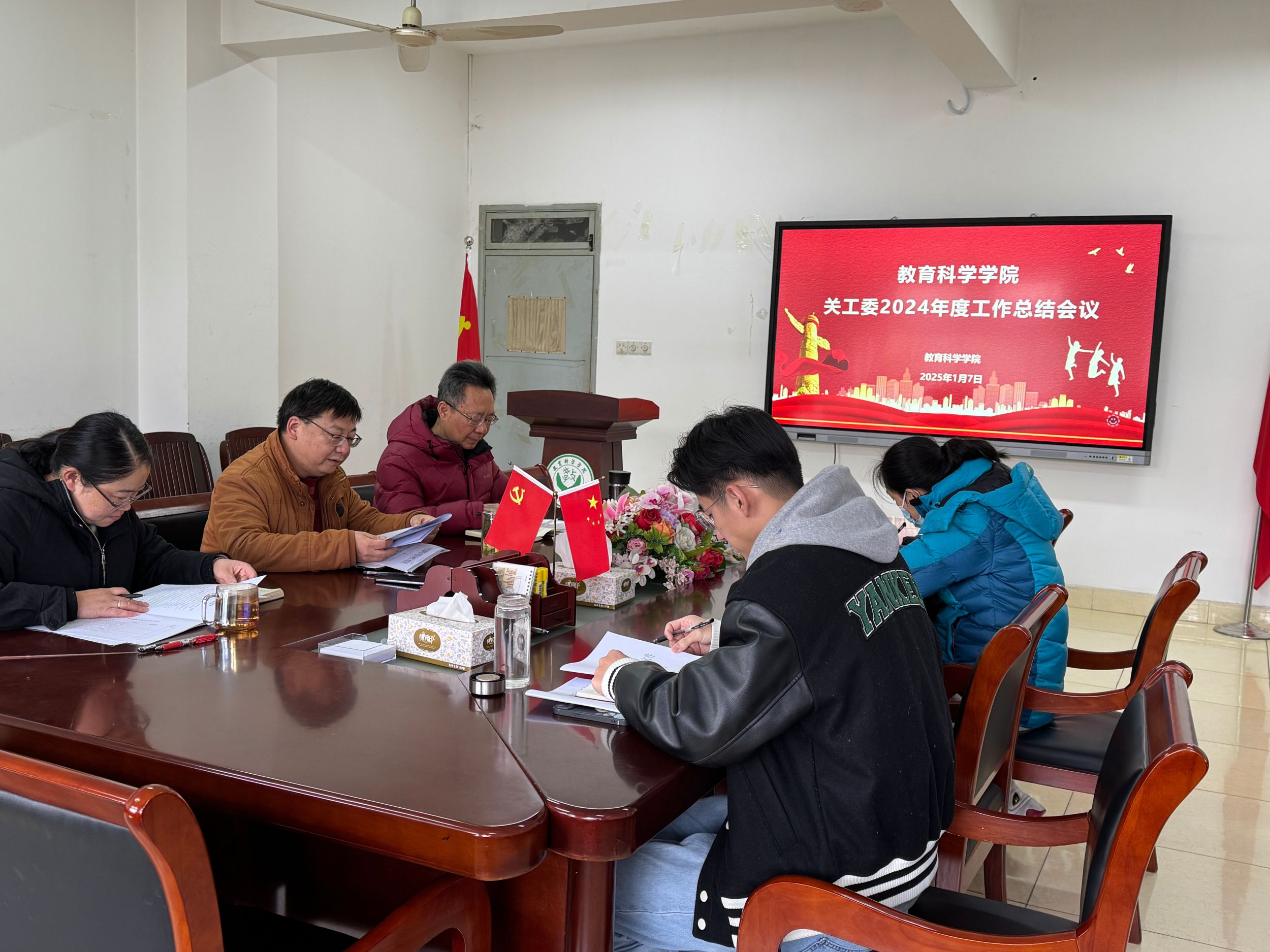 2025年1月7日上午,教育科学学院在院308会议室召开2024年度关工委工作总结会议。院关工委主任许国飞、院关工常务副主任方泓、退休教职工党支部书记王守恒、院党委副书记杜凤、院党委组织员袁黎平、院团委书记付银行参加此次会议,会议由许国飞主持。