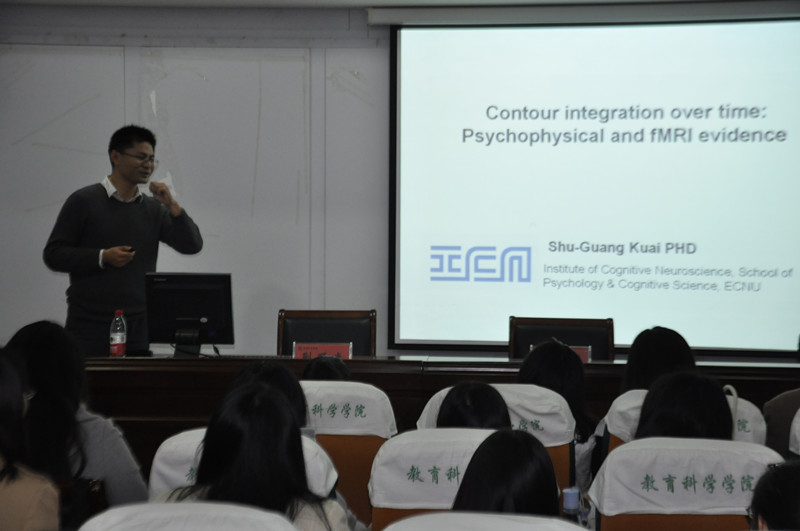 蒯曙光研究员主讲的题目为“Contour Integration over Time:Psychophysical and fMRI Evidence”,报告深入浅出的介绍了fMRI即功能性磁共振成像技术在时空整合与脑机制实验中的应用,并且报告了其在视觉整合和记忆的表征研究中的成果,报告内容丰富,具有很大启发意义。学术报告结束前,蒯曙光研究员还与大家分享了自己的学习生涯和研究经历。