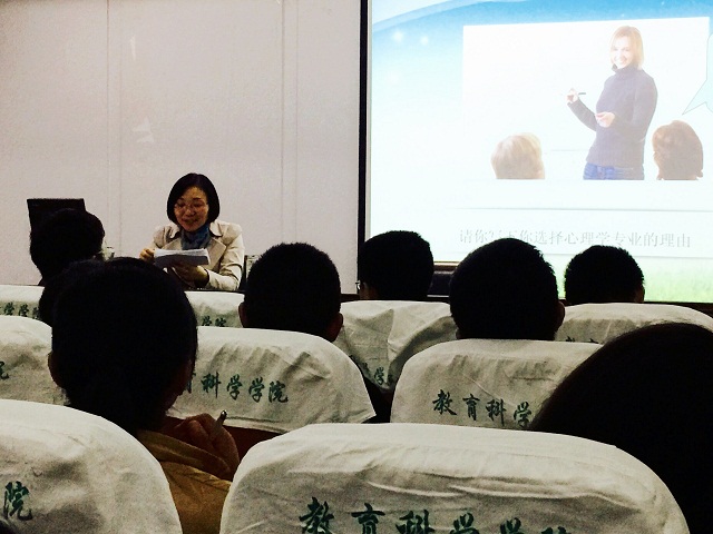 郑老师首先和同学们进行了一个互动的小游戏,这个游戏拉近了讲座与同学们的心理距离。接着由恩格斯的名言“人的心理是地球上最美丽的花朵”引入讲座的主题。“你为何选择心理学?心理学对你的意义在哪?心理学未来的发展方向在哪?”跟随着郑老师提出的三个问题,同学们一步步思考、一点点领略心理学的魅力。最后,郑老师根据自身的经历与同学们分享了心理学给个人生活和工作带来的影响。她感谢心理学给自己带来的幸福和快乐,让她有能力去帮助特殊的孩子,有能力去帮助企业寻找自己的位置,有能力让身边的人更幸福。