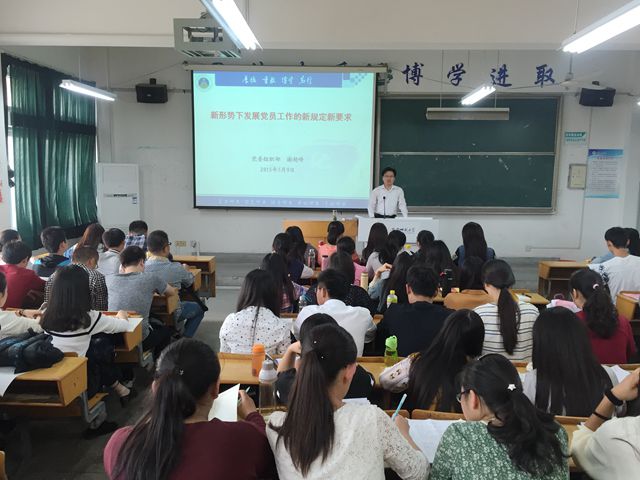 授课期间,谢超峰部长以生动形象的语言从国内、国际环境两个方面细致入微的分析了我党目前遇到的各种挑战。部长指出:“面对挑战,我党要从容成功应对,并以积极姿态从严管党、从严治党,在加大反腐倡廉力度的同时,积极整顿党员队伍”。根据《关于加强新形势下发展党员和党员管理工作的意见》等一系列文件,谢部长提出要按照控制总量,优化结构,提高质量,发挥作用的总要求,来建设一支信念坚定,素质优良,规模适度,结构合理,纪律严明,作用突出的党员队伍。谢部长重点阐述了提高青年入党积极分子和学生党员政治素养的重要性,对全体入党积极分子明确提出要带头坚定信念、勤奋学习、全面发展的目标,要求全体入党积极分子以更高标准规范行为,端正思想,努力成为党员队伍的优秀后备力量。
