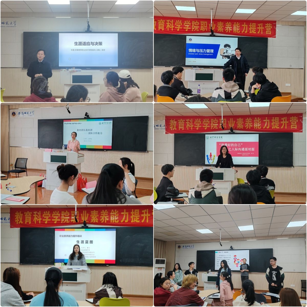 培训班特别邀请安徽省首批职业指导大师工作室负责人、安徽商贸职业技术学院张强教授讲授生涯适应与决策主题,人社部求职能力实训培训师、中国就业促进会职业指导师培训师、安徽一粟企业管理咨询有限公司总经理杨昌骏讲授情绪与压力管理,学院专职辅导员金凤仙、赵茜、蔡文、程雅楠,分别承担团队合作、人际沟通、生涯蓝图、时间管理主题的分享。
