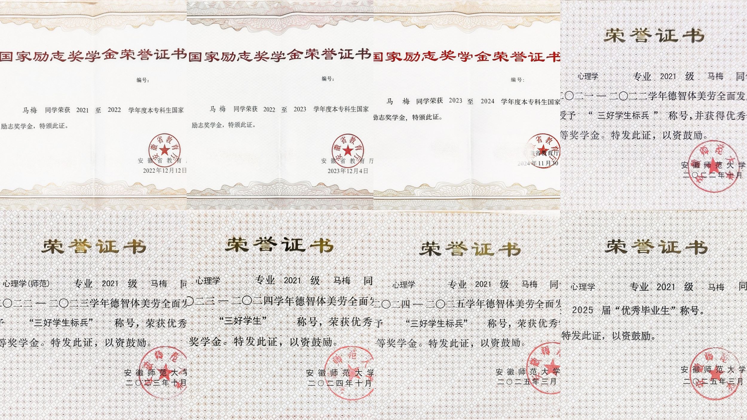 立身百行,以学为基。马梅始终秉持着“行而不辍,履践致远”的信念。她四年平均综合成绩在班级内排名第一,并成功获得推免资格推免至南京师范大学。她曾获得国家励志奖学金、校级一等奖学金及“三好学生标兵”荣誉称号、校级二等奖学金及“三好学生”荣誉称号、校级“优秀毕业生”荣誉称号、教育科学学院“教科之星十佳大学生”等荣誉。此外,她通过了高中教师资格考试和英语四六级考试。在专业实习中获得了优秀成绩。