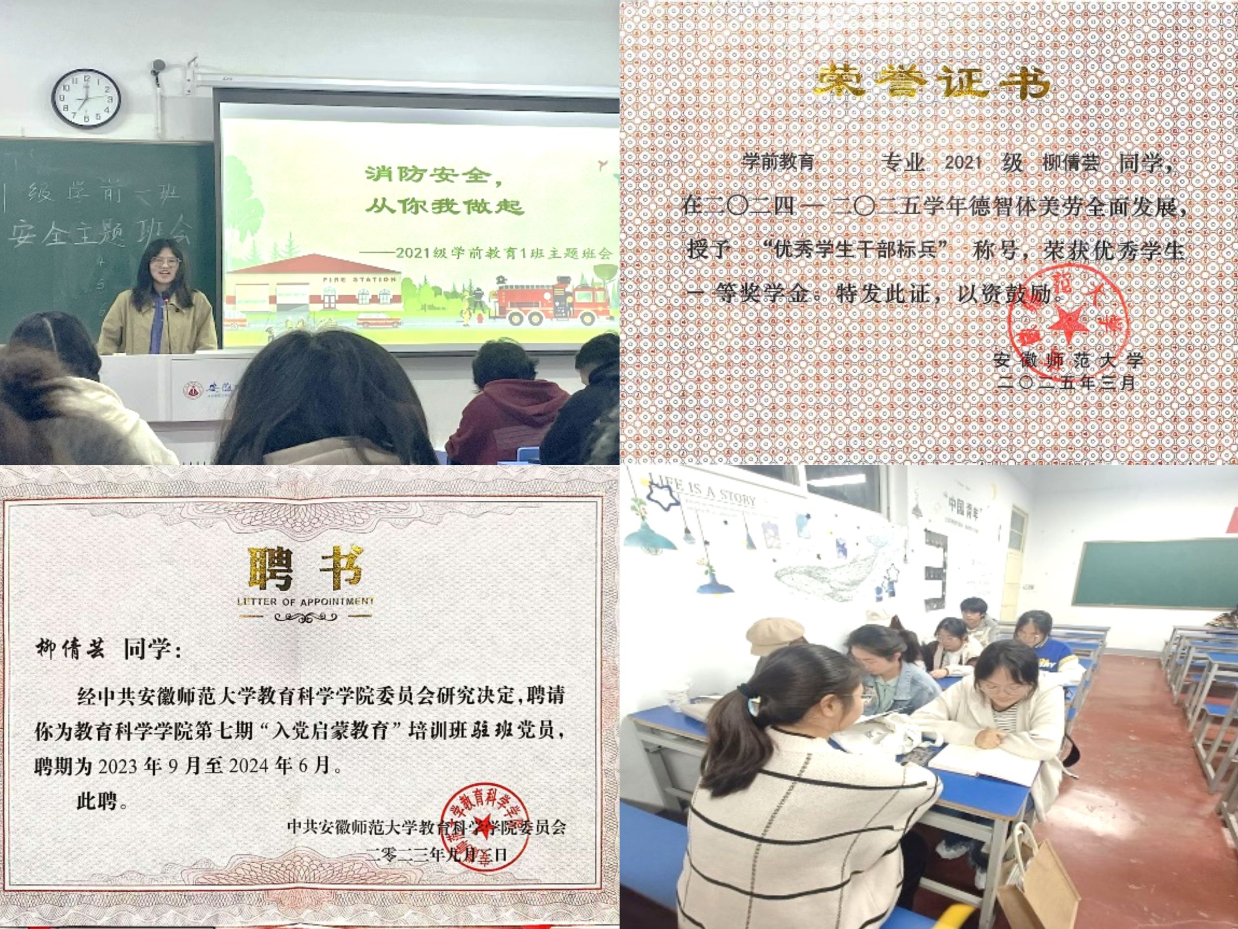 责任大小皆如始,恒守初心未曾移。她担任安全委员两年多来,已坚持连续督促班级同学晚查寝任务500余天,各类安全提醒近50次,召开安全主题班会3次。她已连续四年开展党支部相关活动,从启蒙班学员到先锋导员、驻班党员,再到学前教育本科生党支部组织委员,她从未缺席任何集体活动,认真组织和参加活动超百余次。她作为大四学姐,受邀对学弟学妹进行入党启蒙、坚定入党初心的朋辈帮扶活动,并在毕业之际主动加入学院就业工作小组、考研复试调剂工作组,为毕业生精准推荐就业岗位、收集考研复试信息,其收集总数量位列全院第二。秉持这份坚守,她先后获得优秀社团理事、优秀共青团员、优秀实践个人、三好学生干部标兵、优秀党员等荣誉称号。