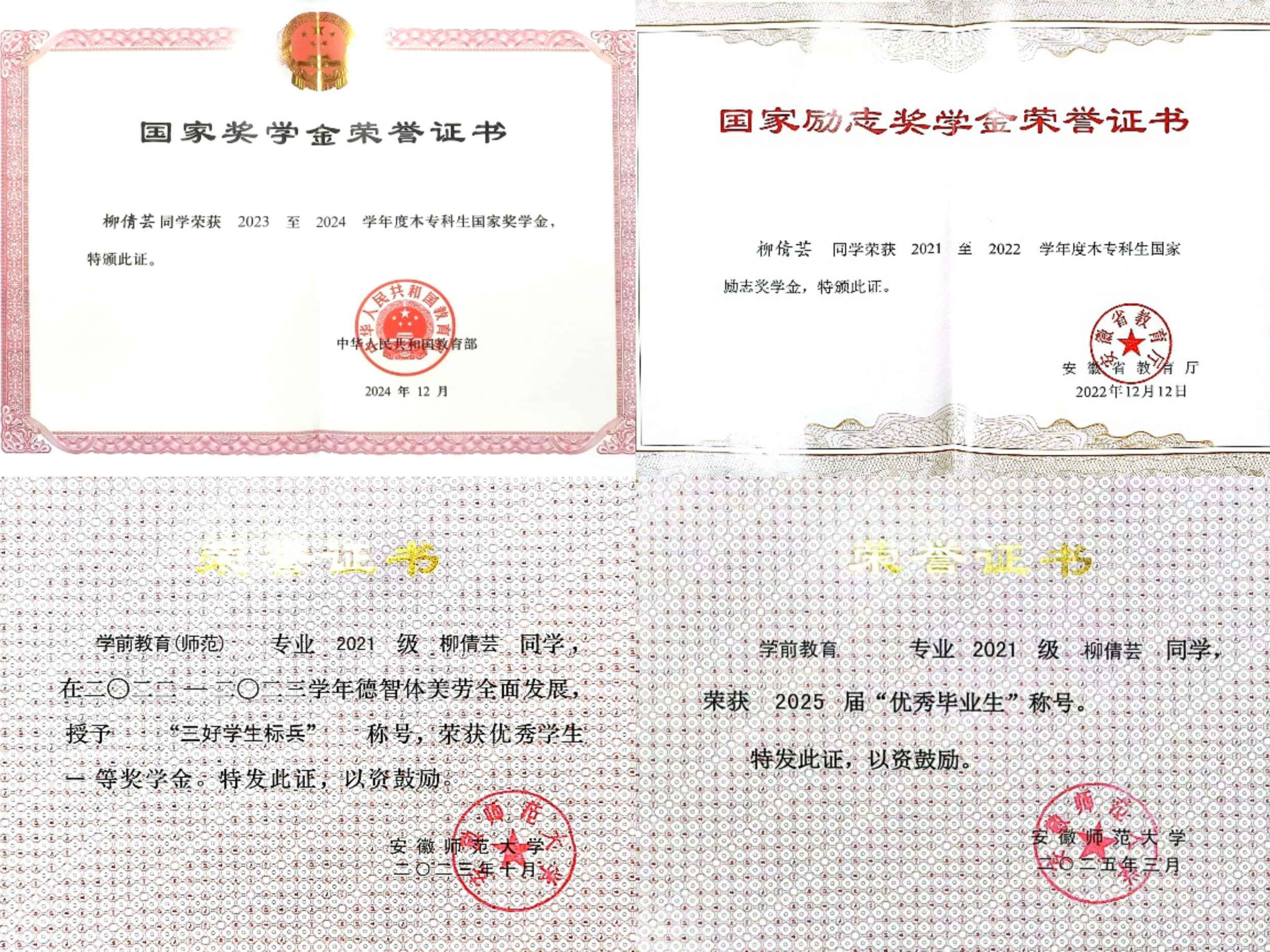 持恒毅之心,探学术之幽微。她连续四年保持智育和综测成绩位列班级第一,超六成专业课成绩达90分以上,现以专业成绩第一成功推免至南京金年会,继续攻读学前教育专业,曾获国家奖学金、国家励志奖学金、校一等奖学金等八项奖学金,获第四届教育科学学院“教科之星十佳大学生”和“安徽师范大学优秀毕业生”等称号。