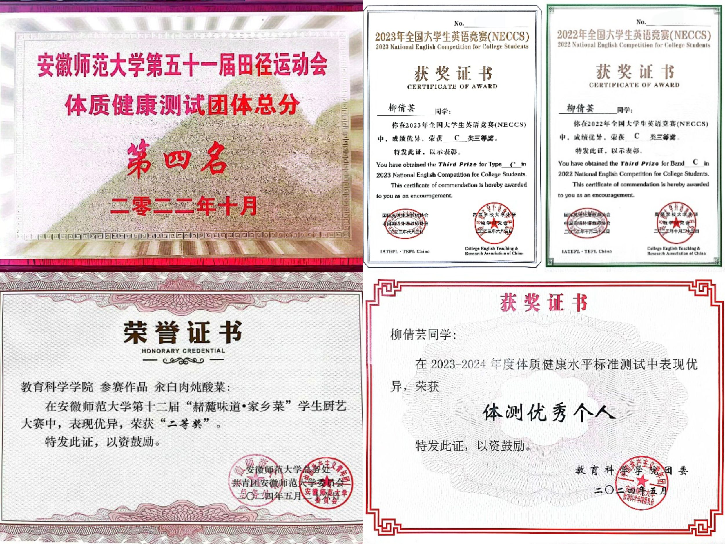 文体兼济,绘就多彩画卷。专业之域,她于理论实践间厚植根基,让智慧之光熠熠生辉,展笃学风采,连续两年获大英赛国家级三等奖,获最美课堂笔记校一等奖、幼儿趣配音大赛院一等奖、高校性道德宣教活动院一等奖等。体育之途,她在汗洒赛场中磨炼意志,使青春活力灼灼闪耀,显飒爽英姿,曾获安徽师范大学第五十一届田径运动会体测团队竞赛校二等奖、赭麓晨光·晨跑锻炼活动校二等奖、“爱运动·迎亚运”拔河友谊赛校三等奖等,并连续两年获“体测优秀个人”称号,累计获得院校级及以上奖项30余项。