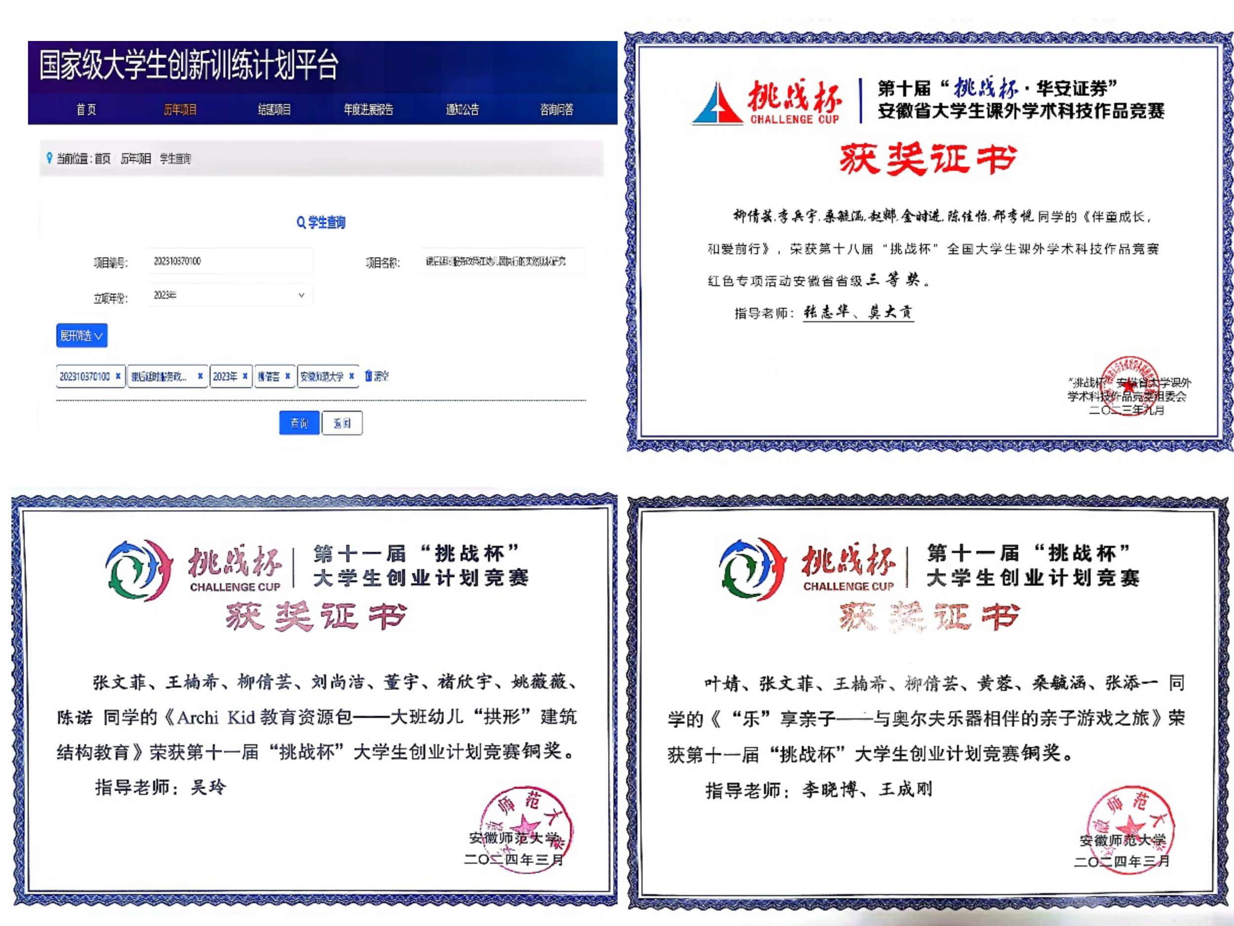 秉谦逊之态,迎未知之挑战。她积极开展科研工作,让理论在实践的土壤中生根发芽,结出创新的果实。作为国家级大创《课后延时服务政策在幼儿园执行的现状研究》项目第一主持人,顺利结项并完成科研论文一篇。在社会实践中,作为团队队长和调研组组长,她保持对教育教学的审视和反思,所完成的《社区混龄活动的同伴互动研究——以芜湖市丽城社区儿童暑期社区活动为例》调研作品获第十八届“挑战杯”全国大学生课外学术科技作品竞赛红色专项活动安徽省省级三等奖。作为核心成员参与两项项目,均获第十一届“挑战杯”大学生学术科技作品竞赛校级奖项。