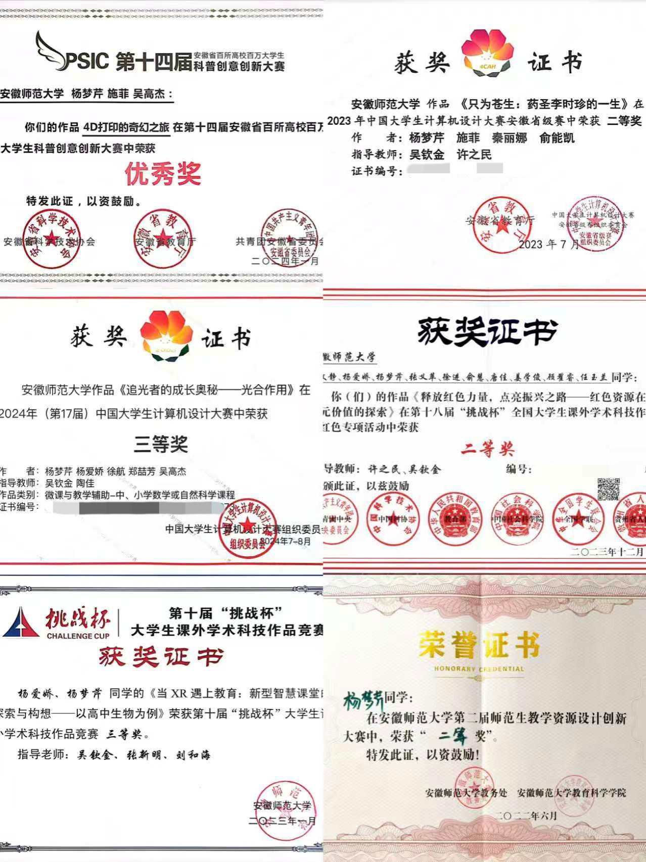 在学科竞赛中,她同样全力以赴。她深知竞赛是锻炼专业能力、拓宽视野的重要途径,因此在大二至大三的竞赛黄金期,她曾多次主动担任队长,组建团队迎难而上。她从零起步,潜心钻研各类软件操作,时常与队友、导师保持高频沟通,反复打磨作品细节。于中国大学生计算机设计大赛中,实现了从省赛二等奖至国赛三等奖的跨越。在国家级大学生创新创业训练计划项目中,她全身心投入科研领域,海量查阅资料深度分析,逐字研读范例反复推敲,最终带领团队成员一起完成了《大学生对生成式人工智能使用意愿影响因素的调查研究》论文。作为团队队员,她以“只要队友需要,我必全力以赴”的担当,携手伙伴攻克重重难关,在第十八届“挑战杯”国赛斩获二等奖、第十四届安徽省科普创意大赛摘得省优奖项。在校期间累计收获4项省部级及以上奖项、近20项校级竞赛荣誉。