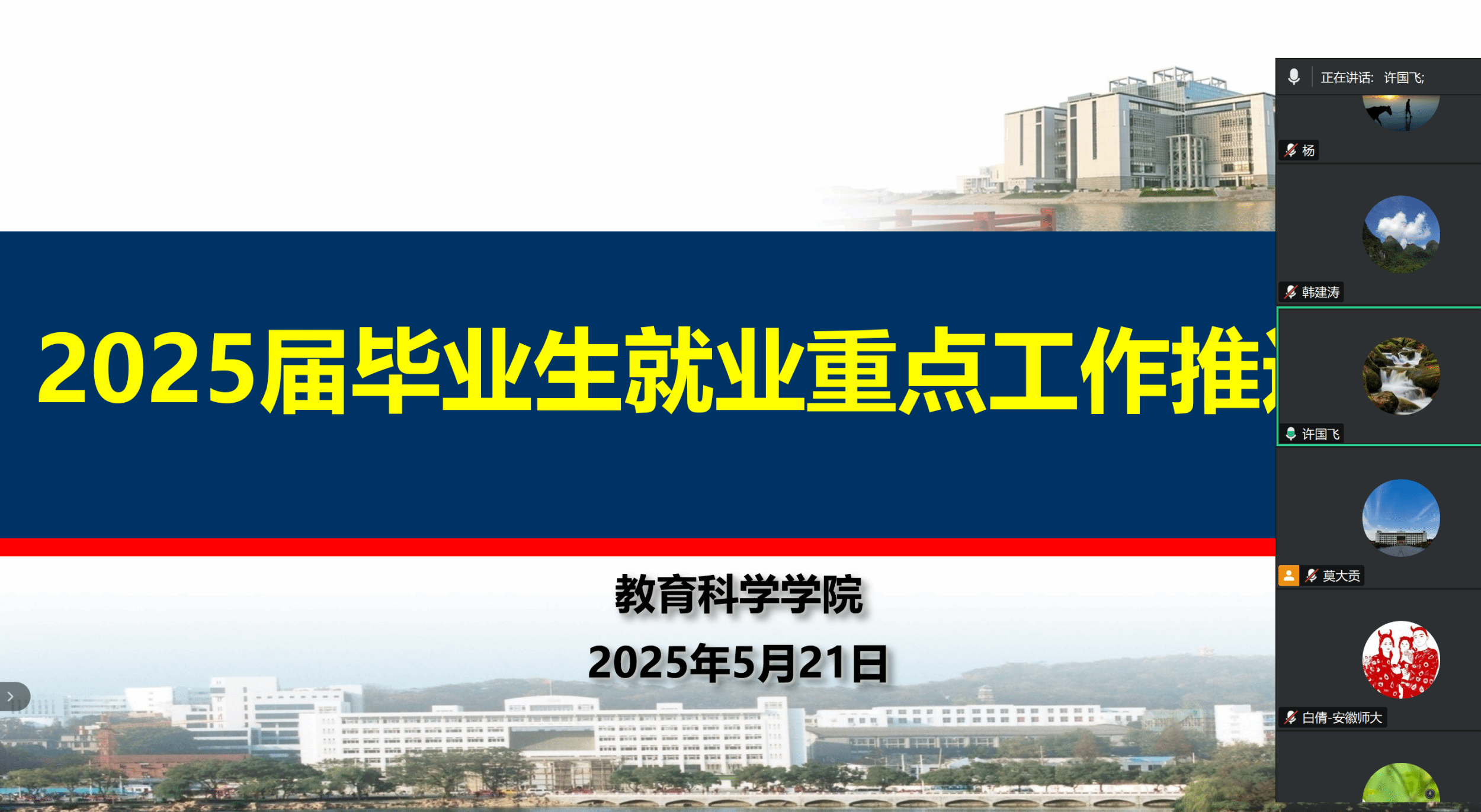为进一步促进毕业生高质量充分就业,2025年5月21日中午,教育科学学院线上专题研究推进2025届毕业生就业工作。学院领导班子、专业负责人、学位点负责人,以及本、研毕业班辅导员参加会议,会议由学院院长吴文涛主持。