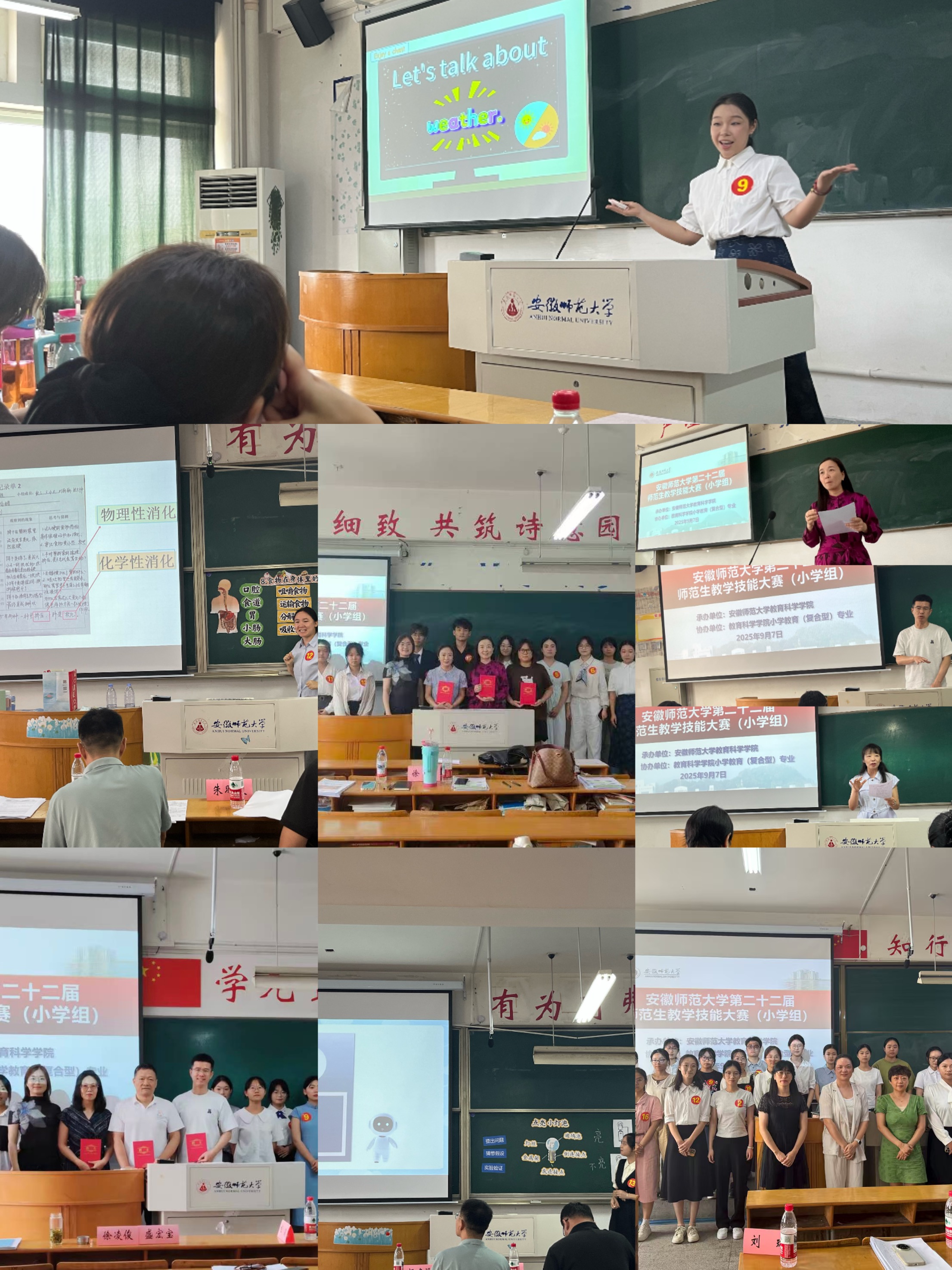 以赛赋能,点亮教育未来。主持人宣布结果后,参赛选手与评委们共同合影,定格荣耀时刻。此次师范生教学技能大赛,以“以赛促学、以赛促练”为核心,不仅全面检验了师范生的专业素养,更锤炼了其沟通应变能力与教育情怀。未来,安徽师范大学将持续以这类赛事为抓手,不断提升师范专业人才培养质量,为培育有理想信念、道德情操、扎实学识、仁爱之心的新时代小学教师奠定坚实基础。