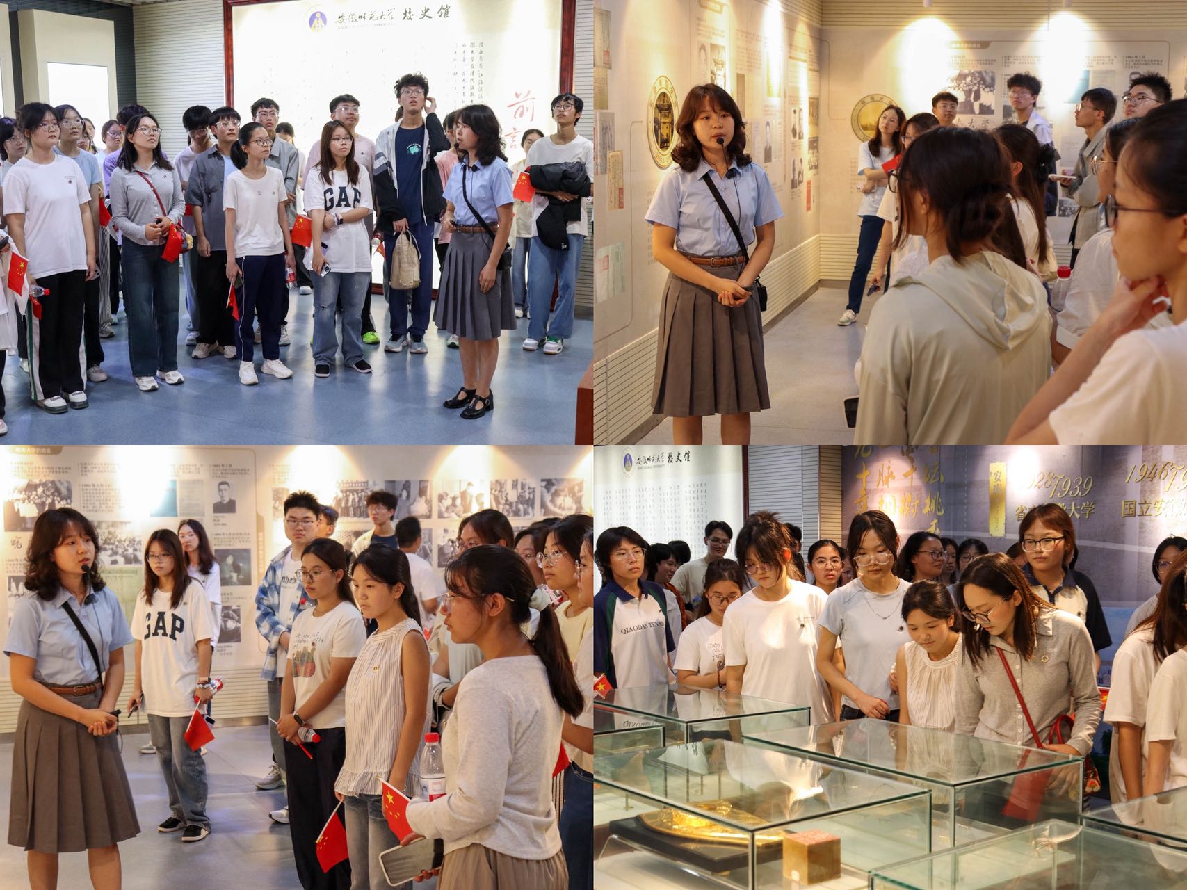 杏坛薪火百年传,桃李新荫又满园。校史馆作为独特的文化空间,是安徽师范大学历史发展的写照和缩影,生动展现了我校自1928年省立安徽大学创立以来的辉煌春秋,诠释着学校弦歌不辍的办学历程。校史馆讲解员结合实物和展板详细向新生介绍了我校的优良历史、丰富的办学成果和卓越的研究成就,让同学们领略到学校深厚的文化底蕴。