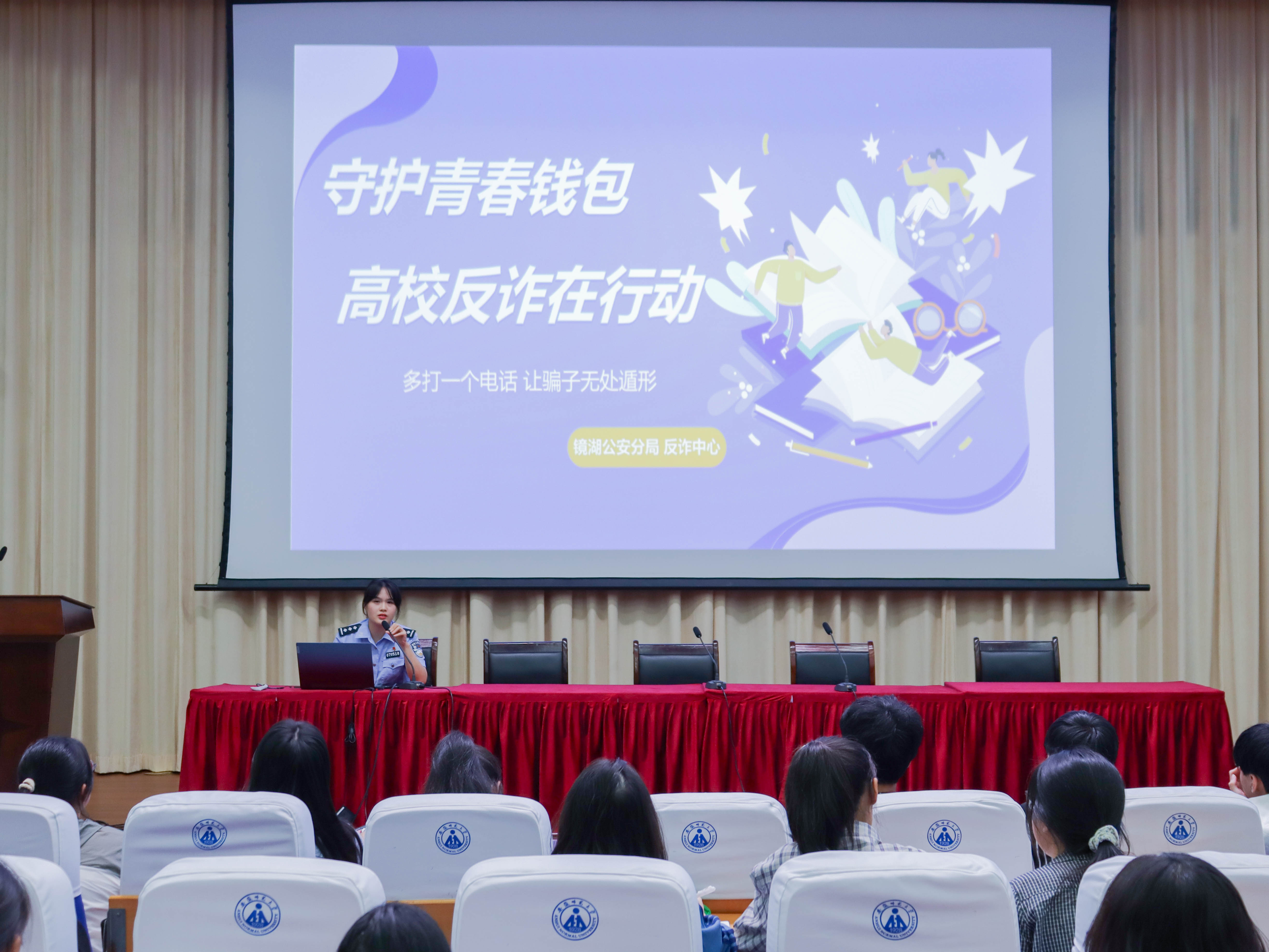 警校联动,反诈宣讲入脑入心。学院特邀镜湖公安分局反诈中心陈思思警官开展“守护青春钱包,高校反诈在行动”专题讲座。陈思思以高校真实案例为切入点,深入剖析了常见诈骗手段与防范要点,重点讲解了“不轻信、不透露、不转账”的“三不原则”,并现场指导新生安装“国家反诈中心”APP,开启来电预警功能,切实提升新生的网络安全防护能力。