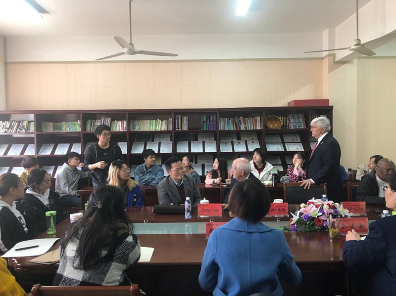 本网讯(程啸 郝婧婧)2019年4月4日,美国布莱诺大学代表团做客安徽金年会,与学前教育(中外合作)的师生进行亲切交流。座谈会由学院桑青松院长主持,美布莱诺大学施奈德校长、米勒主席、尤金院长,校国际交流处处长黄圣炯、基金会郑金泽老师、教科院党委副书记张如华、中美专业负责人赵学菊老师出席此次会议,参会的还有2017和2018级学前中美专业的全体学生。