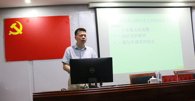 本网讯(汪晴/文李冠楠/图)为促进我院心理学相关专业学生论文写作的规范化,提高论文写作技巧性。5月27日下午,《心理与行为研究》期刊编辑部主任,天津师范大学心理学部教授、博士生导师吴国来应邀来在我院开讲。作题为“心理学论文规范及投稿”的主题讲座,讲座在教科院学术交流中心举行,由我院葛明贵教授主持。