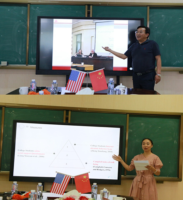 会议伊始,与会人员一同观看了学院对外宣传短片,全方位展示了学院近年来在人才培养、科学研究、社会服务、学科建设等方面取得的突出成效。院长桑青松教授表达了对莱德曼夫妇莅临学院指导的热烈欢迎,并希望两位的到来能对学院学科建设提供宝贵意见。随后,生科院陈明林教授、教科院全莉娟副教授分别就各自的研究领域和研究成果作了主题为《Biological Sciences Education》和《Influence of College Students' Internet Altruistic Behavior and Network Social Support on Subjective Well-being》的英文汇报,莱德曼夫妇从选题意义、研究方法等方面提出了中肯的建议。