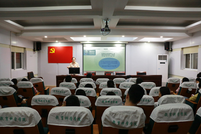 张帅博士开篇大量图片、视频等媒体形式向同学们展示了自己十年的异国求学经历、首尔大学教育技术研究方向的概况以及自己的感想。随即她切入正题,立足教育资源不均衡的现状,对混合型同步教学的定义作出阐述,即线下教学和实时性教学全部联合在一起就是混合型同步教学,同时指出混合型同步教学研究的必要性。报告从混合型同步学习形式、参加创新教育的会议和未来教学最优化的模式三个方面展开。其中着重强调九种学习形式中双生课堂被称为未来教学最优化模式,它能促进两方学生的交流,同时能促进学生和老师以及老师和老师之间的交流,表明这可能是未来教学中非常重要并且非常有效的形式。接着张帅博士以2016年西安雾霾时学校停课两周,老师通过视频教学跟学生保持交流的案例,指出教育技术能够做到停课不停学,再次彰显了混合型同步教学的必要性以及有效性。