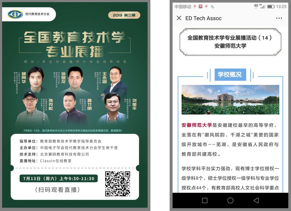 学院领导十分重视这项活动,要求教育技术学专业精心策划、认真准备,积极参加,既要把握交流学习机会,也要展示安徽师大教育科学学院教育技术学专业的办学特色、成绩与风采。为此,聂竹明副院长、张克松主任专门组织部分师生开会讨论相关工作计划,由袁同庆老师指导学生团队拍摄专业宣传短视频,由吴钦金老师指导学生制作专业介绍微信软文,聂竹明、张克松参加本期(第三期)“五系直播”活动。大家克服临近期末、学生面临期末考试放假离校、难以拍摄教学场景等种种困难,全力投入勤奋工作,如期完成专业宣传短视频和微信软文的制作,并于7月11日由主办方在分会微信平台上成功推送发布。