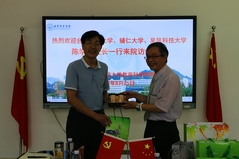 桑青松对陈学志一行来我院访问交流表示热烈欢迎,介绍了教科院从建设初期至今的发展历程、学院的师资、专业设置等,并对台湾师范大学教育学院多年来给予我院青年教师访学工作的大力支持表达感谢!陈学志院长通过一个宣传短片向参会者介绍了台湾师范大学教育学院师资队伍、专业设置、学科建设、整体发展状况等,并表达以后双方学院要进一步加强在学术研究方面的交流和合作,共同促进两院之间科研事业发展。随后桑青松和陈学志作为代表相互赠送礼物,互表心意。