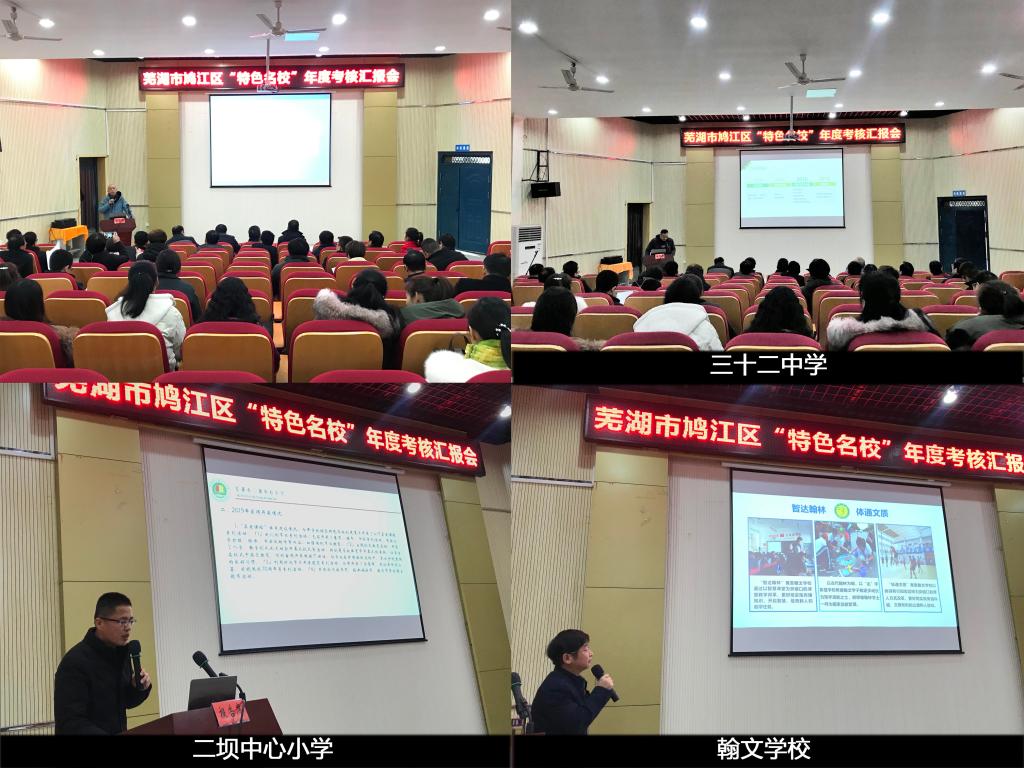 此次会议旨在根据《芜湖市鸠江区教育系统“三名工程”“鸠江特色名校”年度考核方案》,对照鸠江“特色名校”的建设要求,对建设学校开展全面、系统的考评,以期切实发挥特色名校的示范、引领和辐射作用。上午的汇报环节由三十二中学、二坝中心小学、翰文学校、三汊河初级中学、沈巷中心小学、汤沟中心小学、新世纪学校、星辰学校、育才学校、褐山小学、六洲小学依次进行了2019年的特色名校创建总结PPT汇报,五位评委进行现场评分。汇报PPT内容包括特色主题内涵,特色活动开展、特色创建成效、问题与设想四个维度。各校汇报主题分别为“足下逐梦、快乐足球”、“‘向真’特色课程建设”、“智达翰林,体通文质”、“立足三美的养成教育”、“建诗韵校园,韵诗意师生”、“墨香校园,书道育人”、“五育并举,树‘三品’新人”、“学校·社区·家庭三结合教育”、“传承粟裕精神,坚持三全育人”、“构建育心育人的校园生态文化”、“关爱汇聚力量,‘优先’构筑希望”。
