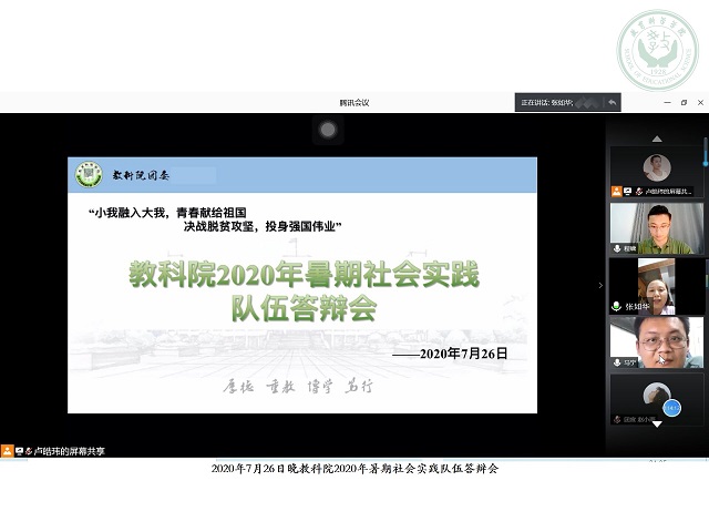 本网讯(教科院 赵小雨)为进一步加强暑期社会实践云端团队建设,增强实践活动的可行性、创新性与实效性,选拔优秀实践团队,教科院团委于7月26日晚七点通过腾讯会议开展了教科院2020年暑期社会实践队伍答辩会。教科院党委副书记张如华、院团委书记程啸、和县青年志愿者协会副会长马宁、12支团队答辩人以及部分学生能代表参与了本次会议,此次答辩会由程啸老师主持。