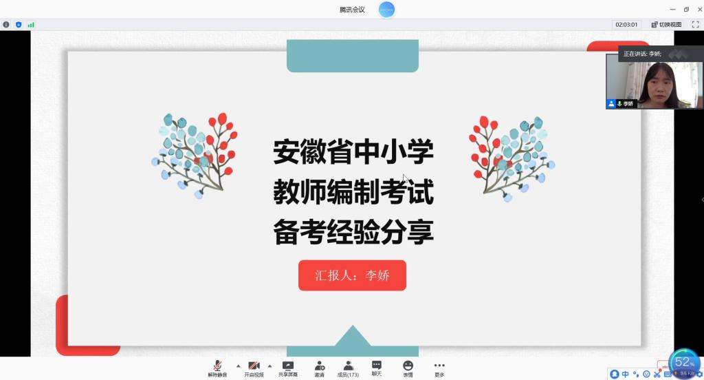 7月25日下午14:00,学院通过腾讯会议开展2020届毕业研究生中小学教师编制考试备考经验分享会。本次活动特邀四位优秀院友:17级非全心理健康专业研究生张云,17级非全小学教育专业研究生陈萍,17级非全教育管理专业研究生李娇,18级小学教育专业研究生叶悠悠。我院副院长聂竹明、研究生管理办公室叶方舟及170余名硕士研究生在线参与,活动由19级教育技术学专业研究生姜惠玲主持。聂院长强调要学习贯彻习近平总书记的回信精神,把落实回信精神同做好毕业生就业“百日冲刺”行动结合起来,确保我院毕业生就业局势总体稳定。强调今年要积极响应国家重大战略,持续拓展多种就业渠道,整合学生就业资源,搭建就业平台;要有针对性地加强毕业生就业帮扶,充分利用校友资源,强化朋辈帮扶,提高毕业生求职能力。
