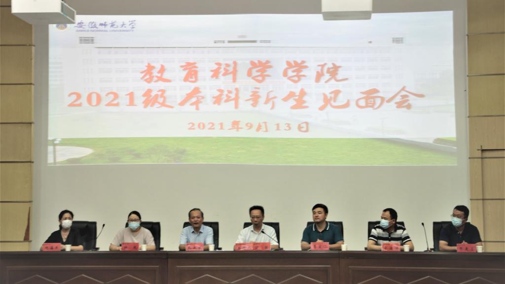 本网讯(教科院 赵小雨)为了让2021级本科新生了解大学生涯发展阶段的特点及任务,帮助广大学子树立正确目标,做好合理规划,尽快适应大学生活。9月13日下午,教育科学学院于赭山校区科技礼堂举办“2021级本科新生见面会”。教科院党委书记方泓,院长李宜江,党委副书记杜凤,副院长辛治洋、何海燕、张更立,学院各专业负责人徐赟、王路曦、陈娜、韩建涛,2021级本科生辅导员赵茜、张理强以及2021级本科生参与会议,会议由方泓主持,特邀教师代表阮成武教授出席参加。