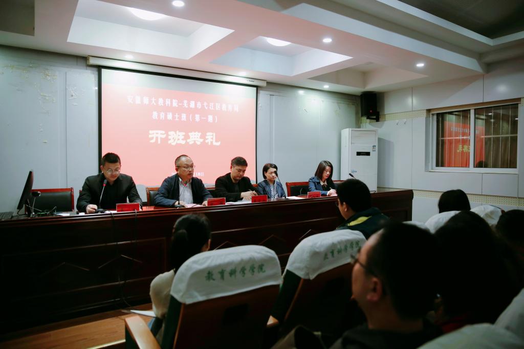 本网讯(文/钟璐 图/叶方舟)10月18日上午,由我院和芜湖市弋江区教育局共同举办的教师硕士班(第一期)开班典礼在三楼学术交流中心成功举行。芜湖市弋江区教育局党工委书记、局长王敏,芜湖市弋江区教育局副局长周虹民,安徽金年会院长、教授、博士生导师李宜江,安徽师范大学继续教育学院副院长、教授方群,安徽金年会教授、博士生导师杨晓奇出席仪式并讲话。此次活动由芜湖市弋江区教育局副局长(挂任)肖文主持,本期所有学员老师到场学习。