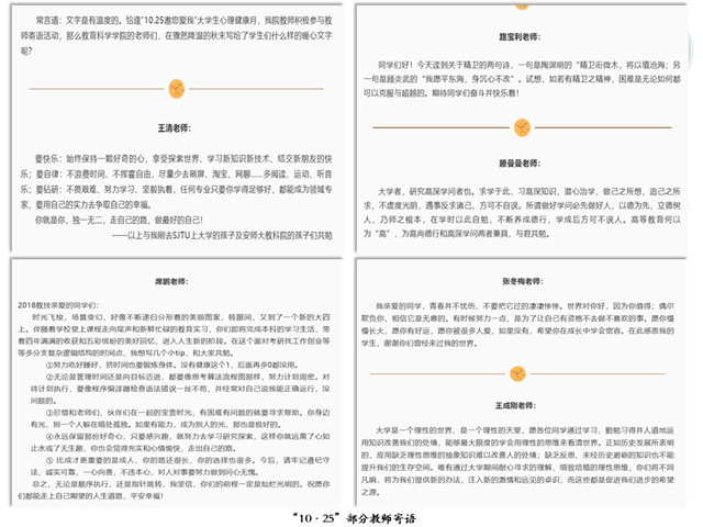 为积极营造健康向上的环境,教科院大学生发展辅导站联合院团委,制作专题展架宣传心理健康教育知识,并发起“教师寄语”征集活动,路宝利、王清、张冬梅、王成刚、高宇、吴钦金、席鹏、滕曼曼、莫大贡、程啸等10位教师为同学们献上温暖寄语,鼓励学生积极向上、不畏风雨,勇往直前、走向成功。此次征集活动形式新颖,不仅拉近了师生的距离,也积极引导了学生的心灵方向。