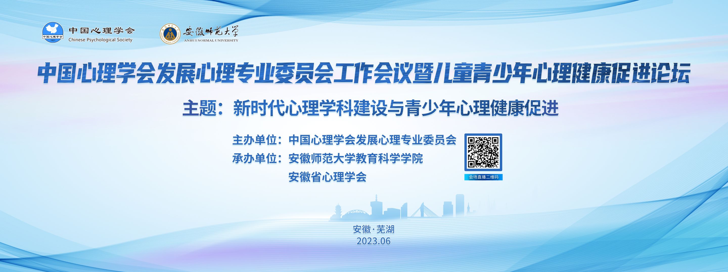 中国心理学会发展心理专业委员会工作会议暨儿童青少年心理健康促进论坛于2023年6月9日至6月11日在安徽芜湖召开。本次会议由中国心理学会发展心理专业委员会主办,安徽金年会、安徽省心理学会承办。大会组委会热忱欢迎全国从事发展心理及相关学科研究与实践的专家、学者和研究生莅临本次会议。