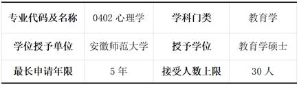 心理学一级学科硕士点包括学校心理学、认知心理学、发展与教育心理学、健康与咨询心理学四个方向。学位点共有研究生导师17人,其中博士生导师5人,硕士生导师11人;教授7人,副教授10人,其中“皖江学者”特聘教授1人,新世纪百千万人才工程”国家级人选1人,中国心理学会认定的“心理学家”3人,安徽省高校学科拔尖人才1人,安徽省学术和技术带头人2人。