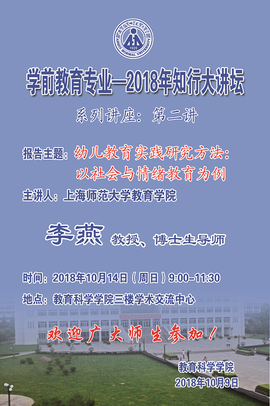 学术报告预告:学前教育专业—2018年知行大讲坛(二)幼儿教育实践研究方法:以社会与情绪教育为例