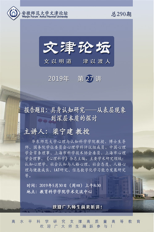 学术报告预告:文津论坛第27讲——梁宁建:具身认知研究——从表层现象到深层本质的探讨