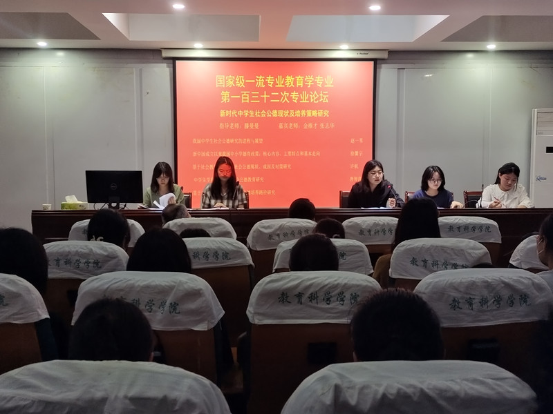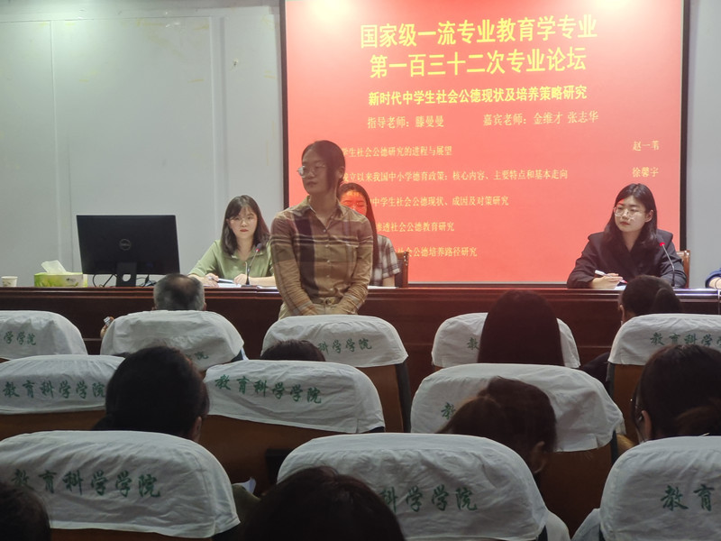 本网讯(文/谢雅雯 图/张思雪)4月24日晚,国家级一流本科专业建设点教育学专业第一百三十二次专业论坛在教育科学学院三楼学术交流中心如期举办。莅临本次专业论坛的有小组指导教师滕曼曼老师以及嘉宾金维才老师和张志华老师,19级、20级教育学专业全体本科生及21级部分教育学类专业本科生到场参加。论坛由19级教育学徐美宣同学担任主持人。