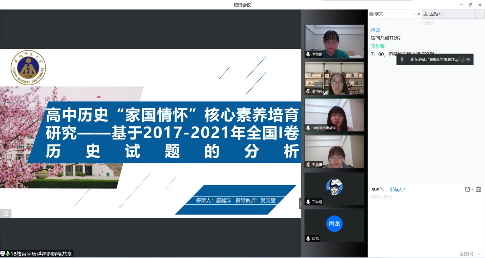 5月4日晚,专业举行第一轮答辩会,共有16名学生参与此次答辩,其中7名同学参与线上答辩。第一轮线下答辩会在学院308会议室举行,邀请金维才、周元宽、吴支奎、柳丽娜、徐赟五位老师参与线下答辩,会议由金维才老师主持。而线上答辩会则由杨晓奇老师为答辩教师组长,尹建锋、杨俊铨、丁向鸣三位老师为答辩组成员,其中丁向鸣老师作为清华附中合肥学校二年级的年级组长,具有丰富的教育教学经验与科研经验,能为学生的论文指导提出切合一线教育教学现状的中肯意见。