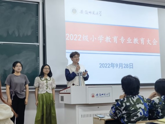 本网讯(教科院 刘子怡)9月28日晚7:00,教育科学学院在教学楼1401教室召开2022级小学教育(全科型)专业教育大会,专业负责人王芳老师,班主任陈元龙老师、吴颖老师和杨俊铨老师,9位班导生和2021级优秀学长、学姐代表以及2022级小学教育专业全体新生参加大会。大会由王芳老师主持。