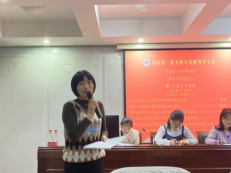 本次专业论坛陈原小组以暑期社会实践报告作为汇报主题,聚焦乡村教育存在的现实问题,探索乡村学校建设与教育发展的可行路径。第一位汇报人陈原根据《新时代家校社协同育人的困境及路径探索》的主题展开论述,以新时代教育发展趋势为背景,厘清和分析家校社协同育人的内涵与困境,并提出合理化建议。第二位汇报人魏珍以《农村小学生假日课外阅读现状及分析》为题,围绕学生假日课外阅读的现状、制约原因及对策建议进行阐述说明。第三位汇报人许菲菲依照《乡村振兴背景下乡村小学特色化发展的路径探析》的主题,指出乡村振兴背景下乡村小学特色化发展过程中的现存问题,并探讨其发展路径。