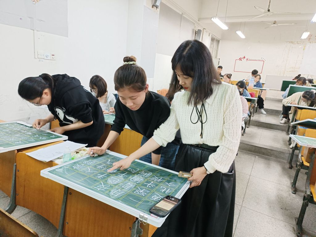 最后,尹老师请几位同学上台示范书写粉笔字,尹老师给出专业的建议和评价,将同学们易犯的书写错误和一些易错字的基本笔画一一详细讲解。同学们纷纷表示从中收获到了许多。