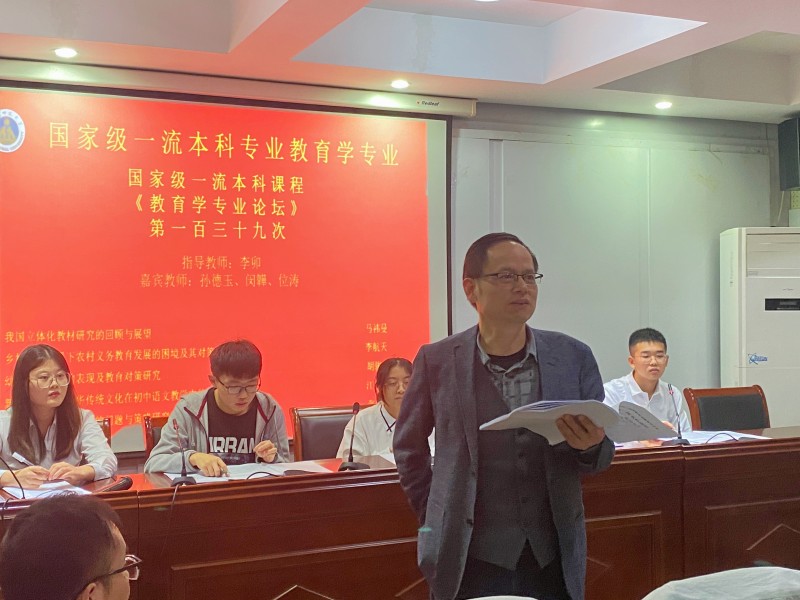本网讯(文/谢雅雯 乔琳颖 图/谢雅雯)11月13日晚,国家级一流本科专业建设点教育学专业第一百三十九次专业论坛在教育科学学院三楼学术交流中心顺利举行。莅临本次专业论坛有嘉宾教师孙德玉、闵韡和位涛,20级、21级教育学专业全体本科生到场参加,并由20级教育学石金杰担任主持人。