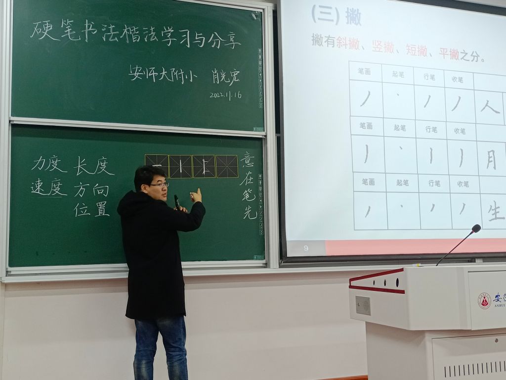 活动中,肖光宏老师从读帖、选帖、临帖等方面展开分享,向大家详细介绍了横、竖、撇、捺、点等基本笔画的写法和需要注意的地方,强调了写字时需要把握好笔画的长度、方向、位置、比例、间距以及写字的速度和力度,注重汉字结构的正、匀、中宫紧凑、收放得宜、错落有致以及穿插避让,并在讲解的过程中进行了亲身示范。肖光宏老师还向同学们展示了个人及古代书法家的优秀书法作品,鼓励同学们在经典中吸取汉字的规律,欣赏书法的独特魅力,在练好字的同时形成个性化的风格。