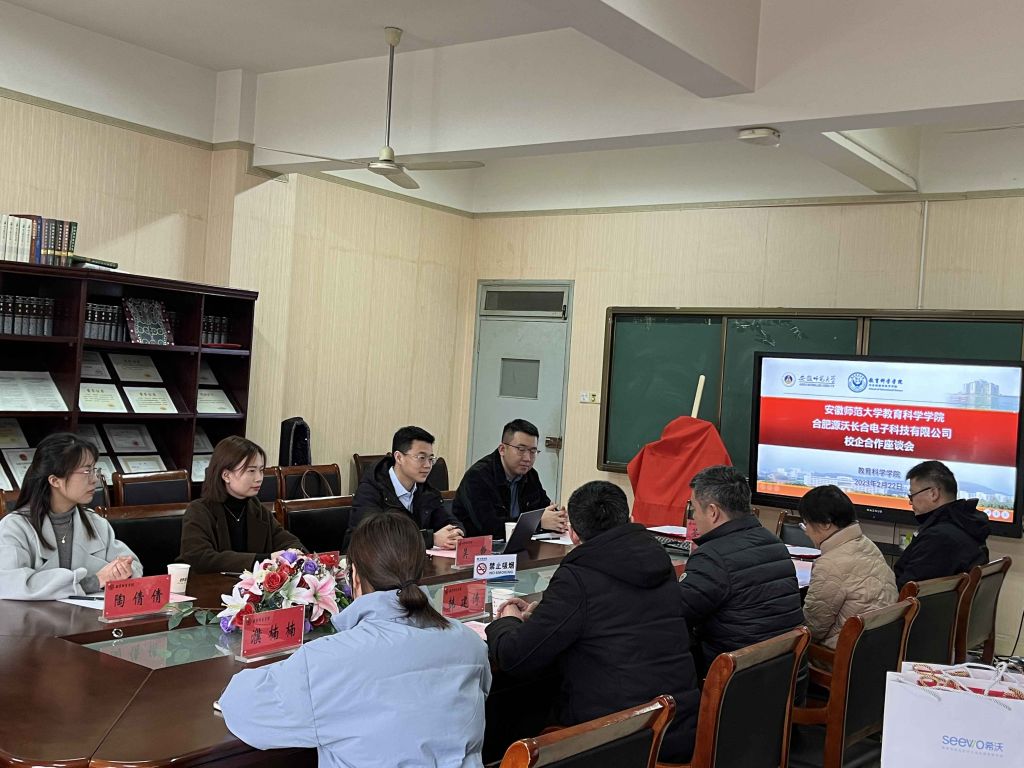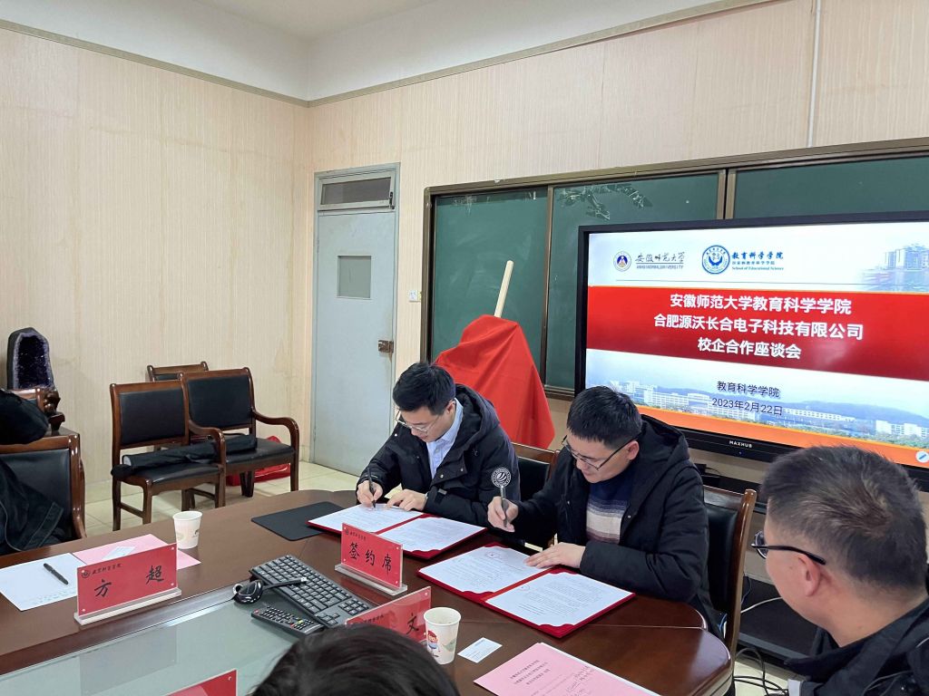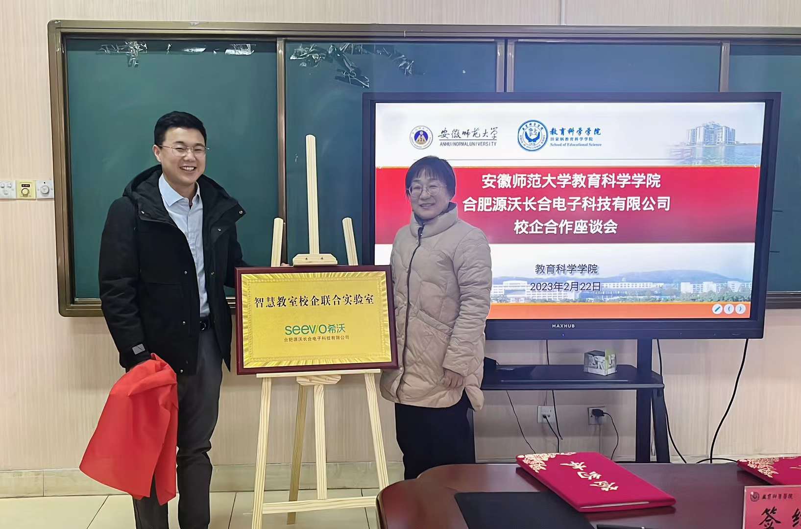 座谈会上,李宜江院长介绍了我院在学科建设、人才培养等方面的基本情况;吴铮总经理介绍了合肥源沃长合电子科技有限公司相关业务的开展情况;韩建涛副院长和吴铮总经理分别代表学院和企业签订了校企合作框架协议;袁晓斌老师和吴铮总经理为智慧教室校企联合实验室揭牌。双方就共建校企联合实验室、教师教育课程开发、本科生实习实践与就业等问题展开了深入交流。