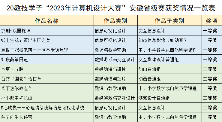 522日,“2023年(第16届)中国大学生计算机设计大赛省级赛结果出炉,经过激烈角逐,20级教育技术学本科学子依托教育研习(四)课程产出的省赛14件入围作品中,13件作品获优胜以上奖项,获奖率达到92.9%。其中,省一等奖4省二等奖6件,共5件作品获得了入围国赛的资格,取得了该项赛事省级赛获奖成果的新突破。