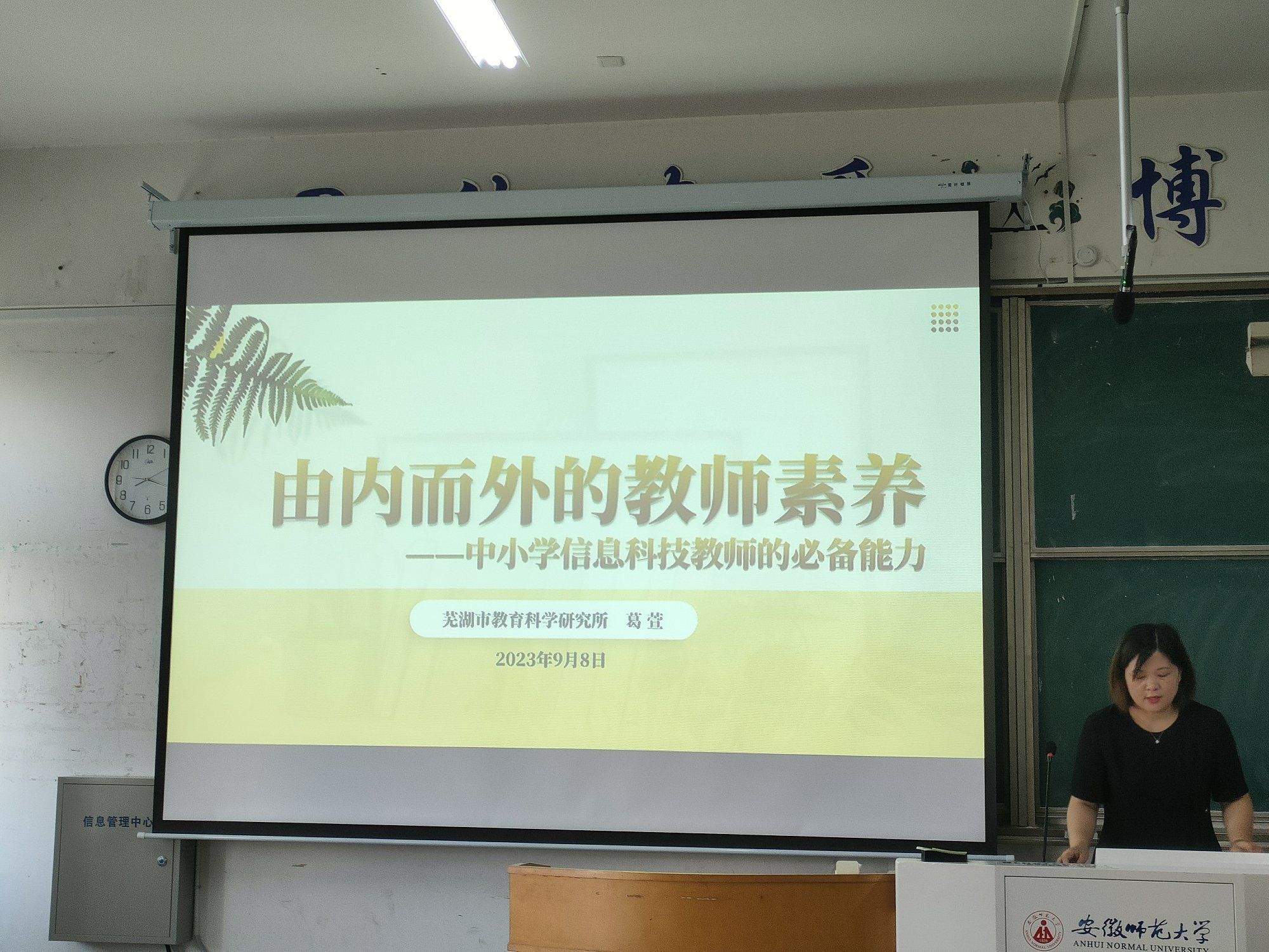 会议第二阶段,芜湖市教科所信息科技学科教研员葛萱以《由内而外的教师素养--中小学信息科技教师的必备能力》为题进行了教育实习专题培训。葛萱老师从学科育人目标、学科专业素养、教师礼仪规范三个方面对当前信息科技(技术)学科教师必备素养进行了深入解读,结合往年高水平教学案例讲解了大单元、项目式教学设计的基本思路和要求,并要求同学们要以作为新时代教师为目标,积极拓展专业知识,聚焦信息技术前沿,不断提高自己的教学能力。