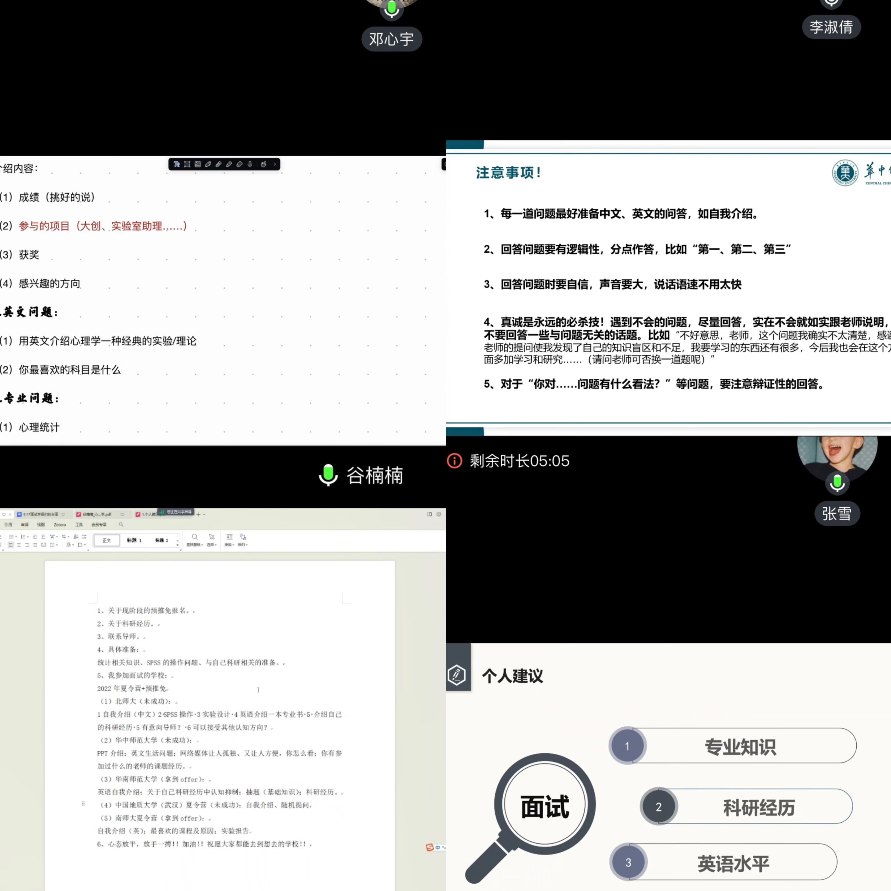 会上,王礼军老师首先向20级的同学介绍了5位优秀的学姐,并代表心理学专业及教育科学学院对她们的无私奉献和大力支持表示由衷的感谢,同时祝贺获得推免资格的同学们,希望他们能充分学习学姐的宝贵经验,在后续的推免考核中取得成功。随后,5位同学根据自己的经历和经验依次作出分享,其中,南京师范大学在读研究生邓心宇从多个方面讲述了自己的推免面试准备,如中文和英文版的自我介绍、英文问题、专业理论知识、自己的实验研究等。华南师范大学在读研究生谷楠楠建议大家多分享经验、信息,同时释放压力、缓解焦虑,面试时可扬长避短,突出自己的优势,根据学校特性、导师个性等选择心仪导师。华中师范大学在读研究生李淑倩建议大家要多关注院校的招生情况,对于招生人数与专业类别要有清晰把控,并从科研经历、专业知识和未来规划等方面分享了自己面试的经验总结。推免至北京师范大学的张雪从夏令营、预推免、正式推免三个程序作出分享,并建议学弟学妹们夯实专业知识、突出科研经历、加强英语表达。就读于首都师范大学的施雅文指出推免期间要稳住心态,建立自信心。