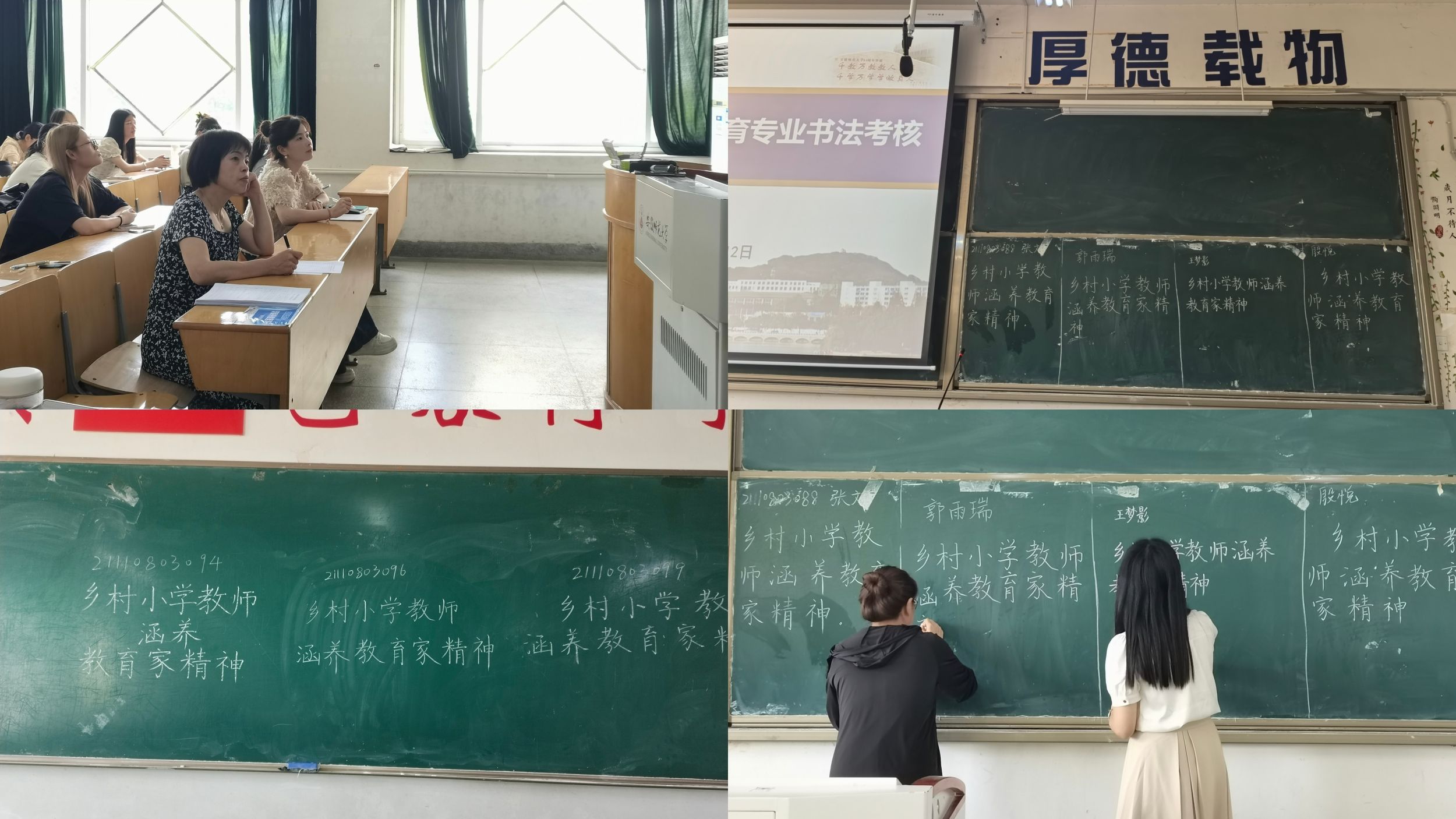 规范、端正、整洁、流利地书写“三笔”字楷书是师范生的基本素质。为进一步规范汉字的书写,培养师范生良好的书写习惯,6月12日下午两点半,2021级小学教育专业全体同学在田楼8201、8202教室举行了书法考核活动。考核活动由小学教育专业负责人王芳老师组织,并邀请学院夏益军老师、陈晨老师、魏晓敏老师共同担任评委。