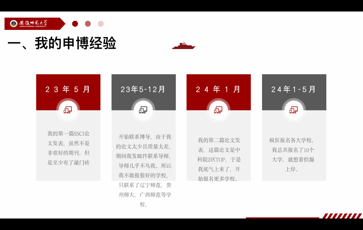 江雨潜,安徽师范大学发展与教育心理学学术型硕士,硕士期间发表英文SSCI论文两篇,现已被浙江师范大学录取为心理学博士研究生,2024年获校研究生“学术之星”提名奖。他从申博经验、前期准备和报考流程三个方面带来分享。他指出申请考核制、普通招考和硕博连读三种读博途径的区别,并从自身具体的申博经验出发,为学生们分享了申博的关键时间节点,以及各环节的注意事项。