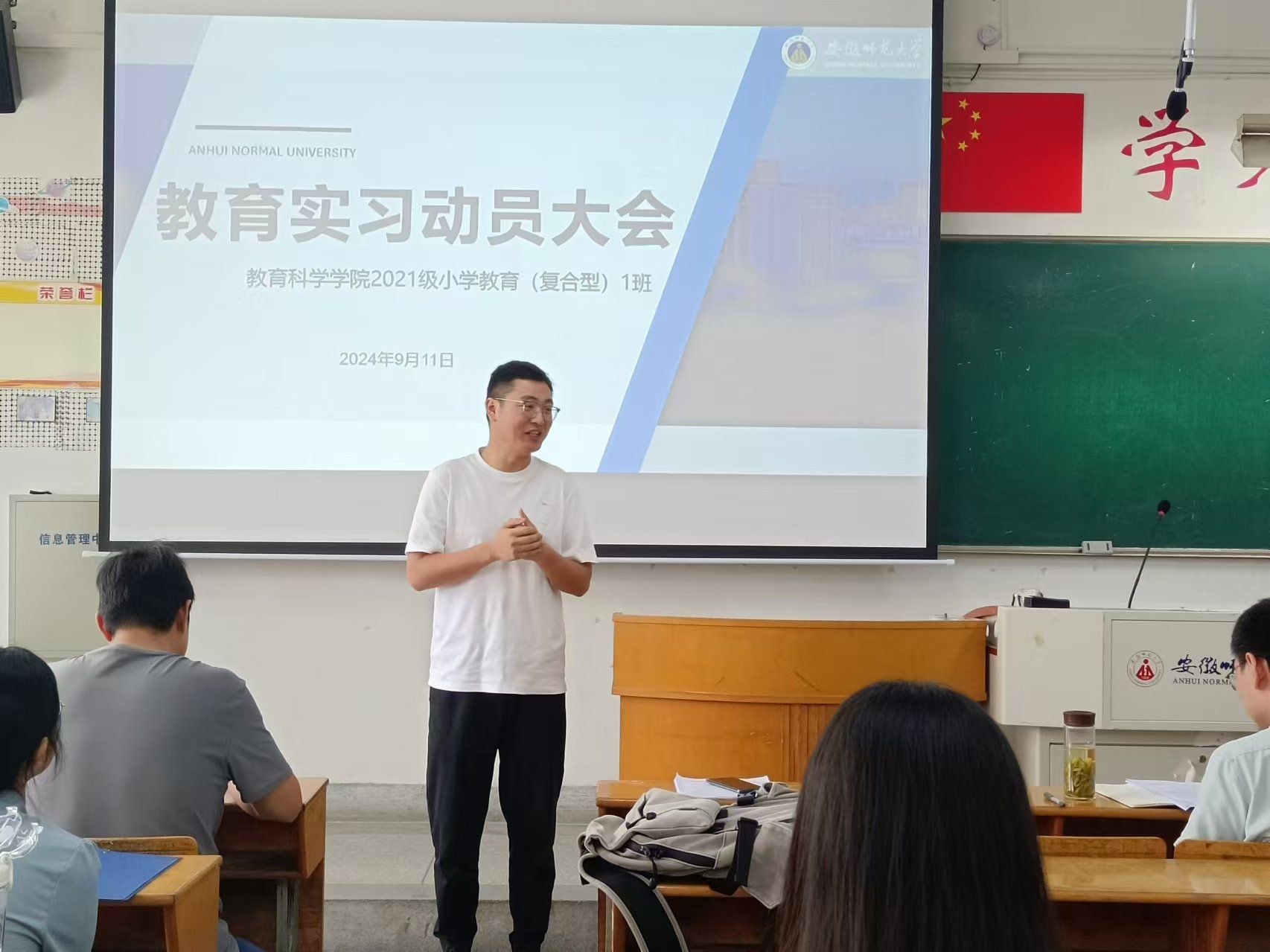 为了增进学生对教育实习的了解,做好相应的实习准备,教育科学学院2021级小学教育(复合型)专业于9月11日下午14:30在赭山校区田楼8309教室开展教育实习动员大会。学院副院长韩建涛,专业负责人杨俊铨,实习指导教师肖龙、刘婉、胡薇、陈元龙,辅导员赵茜,2021级小学教育(复合型)专业全体本科生参与其中。会议由叶格格主持。