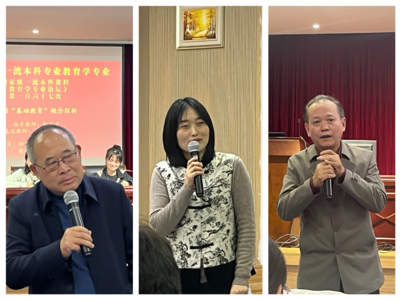 随后,嘉宾教师周兴国肯定此次论坛行文逻辑很清晰。接着他提出自己的几点见解。第一,从目标维度来比较我国学者对基础教育的理解是不够的。第二,概念探析最后应该得出分析性的结论。第三,“基础教育”的本初来源没有解释清楚,任何话语都要有依据,这样论述才有分量。第四,概念内涵和外延的关系不能孤立考论。