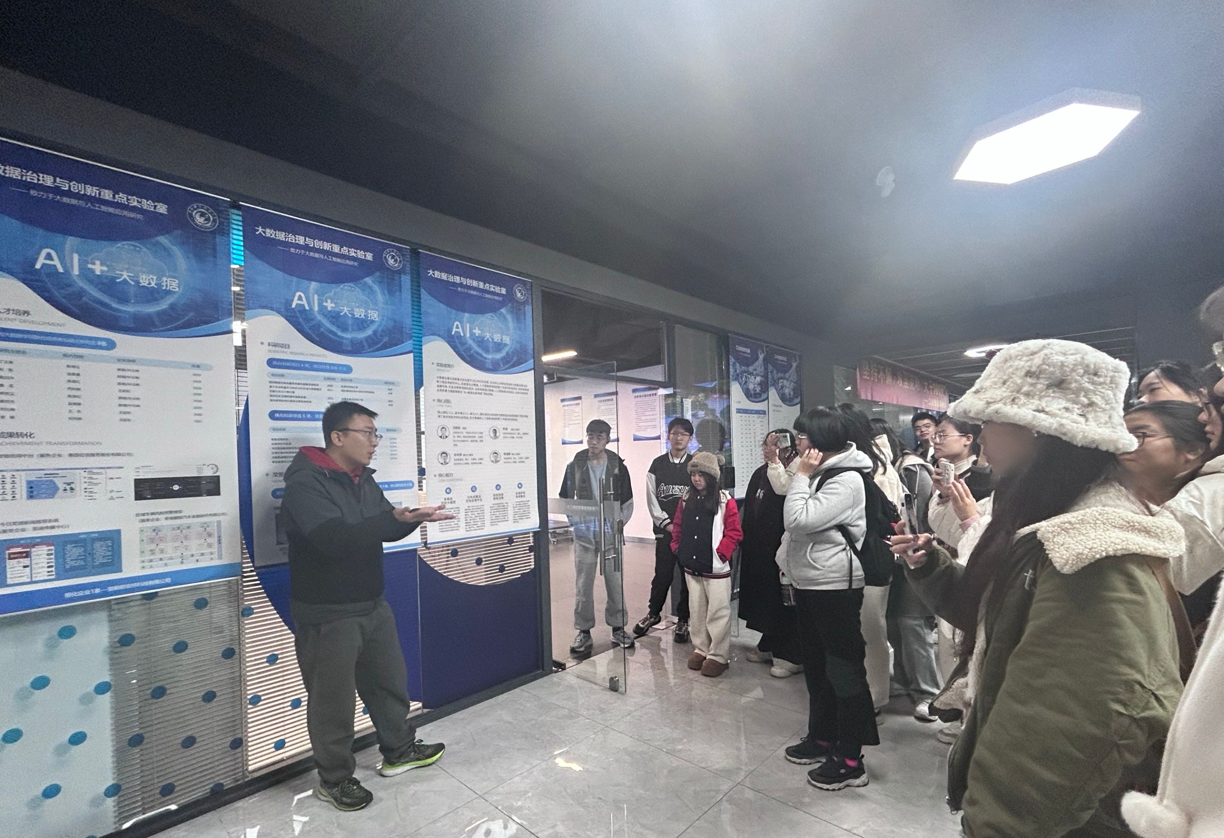 最后,张博士带领专业同学参观了四楼的实验室中心,并介绍研究院的重点研究项目。研究院以AI技术为核心,推动AI与大数据、基层治理、工业、医学病理等多个领域的深度融合与创新应用。学生们通过与研究项目负责人的交流与共同,了解如何通过AI推动科技创新、产品研发,输出解决方案,以及利用人工智能技术辅助决策和优化流程,将前沿的AI技术转化为实际的产业动力和社会价值。